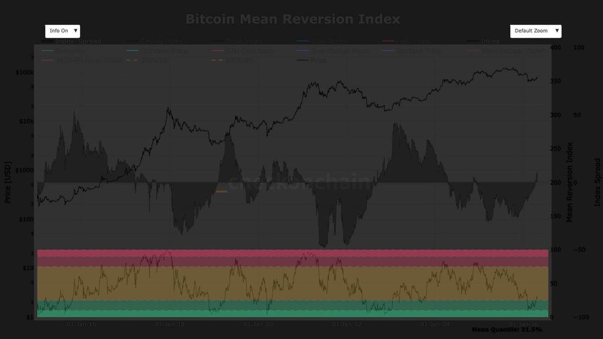 Search/NewsVideoPricesResearchConsensus 2026Data & IndicesSponsoredSearch/enMarketsShareShare this articleCopy linkX iconX (Twitter)LinkedInFacebookEmailBitcoin at $40,000 would be 'near-unprecedented' statistical outcome, analyst saysMean-reversion models suggest bearish targets imply a 0.4th percentile event, far beyond typical market corrections.By James Van Straten|Edited by Sheldon Reback Apr 25, 2026, 3:00 p.m. Make preferred on Bitcoin Mean Reversion Index (CheckonChain)What to know: A drop to $40,000 would place bitcoin in the 0.4th percentile of historical price deviations, making it one of the most statistically extreme events on record. At around $78,000, bitcoin currently sits near the 31.5th percentile, indicating a historically weak, but still normal, correction range.Bitcoin's BTC$77,359.29 recent gains — it's added almost 15% this month — aren't enough to convince some in