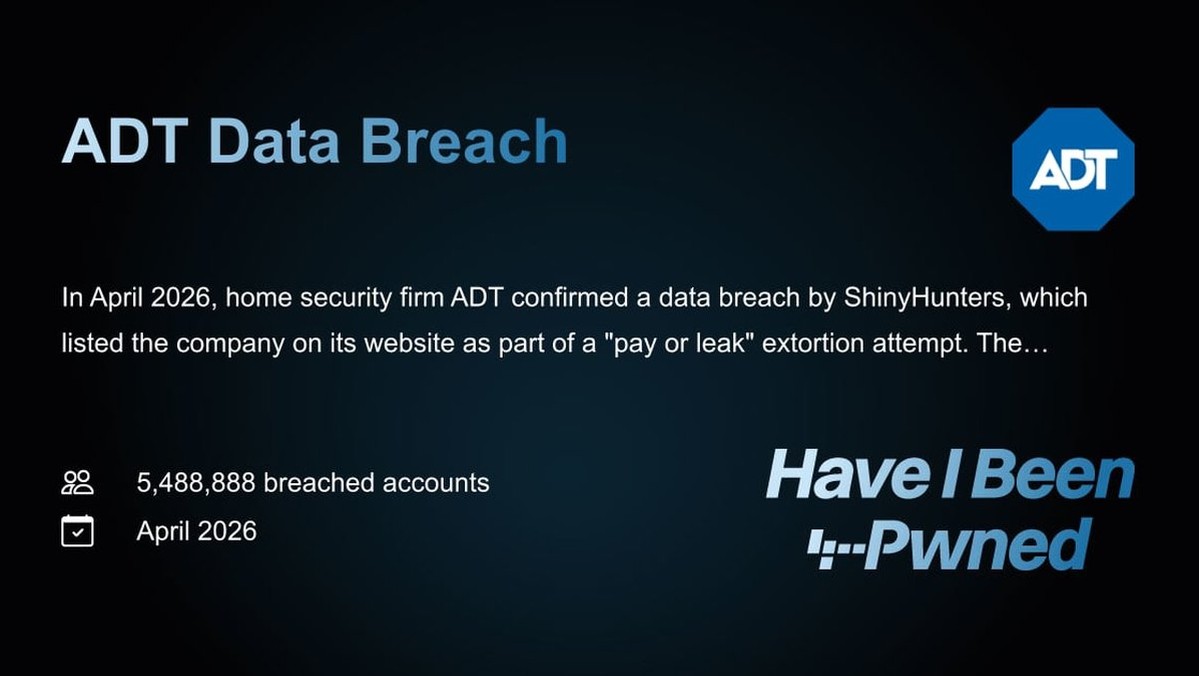 In April 2026, home security firm ADT confirmed a data breach by ShinyHunters, which listed the company on its website as part of a "pay or leak" extortion attempt. The breach impacted 5.5M unique email addresses along with names, phone numbers and physical addresses. ADT also advised that "in a small percentage of cases, dates of birth and the last four digits of Social Security numbers or Tax IDs were included" and that it had contacted all affected people. Use a password manager to generate and store strong, unique passwords for all your accounts. 1Password helps protect your data with industry-leading security. In Nederland adviseert een samenwerking van publieke en private organisaties mensen over hun online veiligheid op veiliginternetten.nl. If you haven’t already changed the password affected by this breach, do so immediately on every account where it was used. Wherever 2FA is su