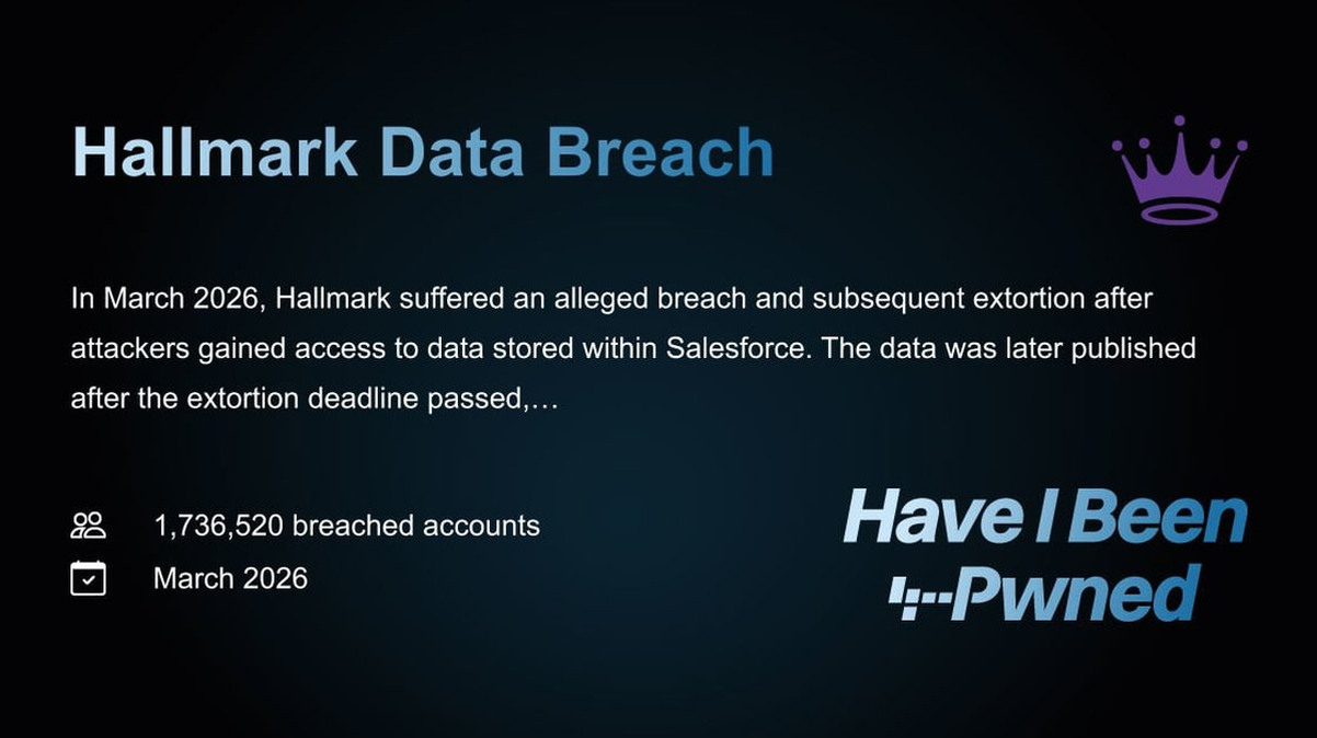 In March 2026, Hallmark suffered an alleged breach and subsequent extortion after attackers gained access to data stored within Salesforce. The data was later published after the extortion deadline passed, exposing 1.7M unique email addresses across both Hallmark and the Hallmark+ streaming service, along with names, phone numbers, physical addresses and support tickets. Use a password manager to generate and store strong, unique passwords for all your accounts. 1Password helps protect your data with industry-leading security. In Nederland adviseert een samenwerking van publieke en private organisaties mensen over hun online veiligheid op veiliginternetten.nl. If you haven’t already changed the password affected by this breach, do so immediately on every account where it was used. Wherever 2FA is supported, add an extra layer of security to your account. Use a password manager to generat
