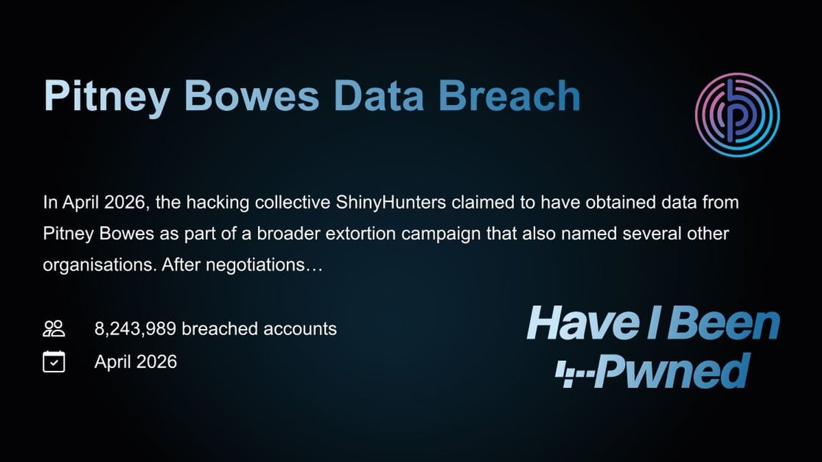 In April 2026, the hacking collective ShinyHunters claimed to have obtained data from Pitney Bowes as part of a broader extortion campaign that also named several other organisations. After negotiations allegedly failed, the group publicly released the data which included 8.2M unique email addresses, along with names, phone numbers and physical addresses. A subset of the data also included Pitney Bowes employee records with job titles. Use a password manager to generate and store strong, unique passwords for all your accounts. 1Password helps protect your data with industry-leading security. In Nederland adviseert een samenwerking van publieke en private organisaties mensen over hun online veiligheid op veiliginternetten.nl. If you haven’t already changed the password affected by this breach, do so immediately on every account where it was used. Wherever 2FA is supported, add an extra la