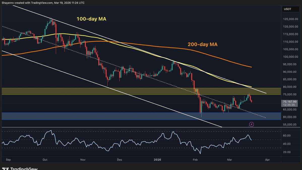 Биткоин, едва держась у психологической отметки в $70 000, балансирует на краю пропасти. Техническая картина безжалостна: с пиков октября 2025 года выше $125 000 актив рисует серию снижающихся максимумов в рамках нисходящего канала. Ключевые скользящие средние на $80 000 и $92 000 теперь являются непреодолимым сопротивлением. Единственный луч надежды — зона поддержки $58 000–$62 000, но её пробитие откроет путь к катастрофе.