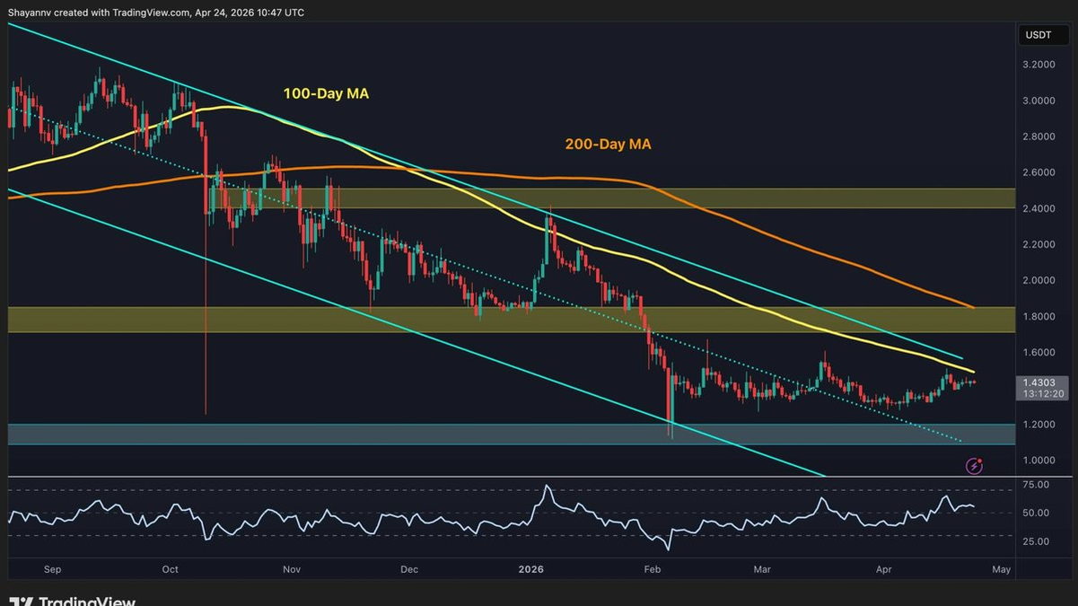 Dark Mode Toggle Ball Crypto News Today Market Updates Margin Trading Guides Videos Price Analysis BTC Analysis ETH Analysis XRP Analysis Bitcoin For Beginners Interviews Editorials DeFi & NFT Buy Crypto Language Bulgarian Turkish Spanish © Copyright CryptoPotato Home » XRP While Bitcoin is at $77k and climbing, XRP is trading at $1.43, roughly where it has been over the last three months. The altcoin’s inability to participate in one of the market’s most sustained recovery phases raises a legitimate question: is XRP facing a temporary lag, or is something more structural at play in its relative performance? The descending channel that has contained XRP since the late 2025 peaks remains unbroken, and the distance between the current price and any meaningful resistance continues to make the recovery thesis a difficult one to argue. The 100-day moving average has now declined to approximat