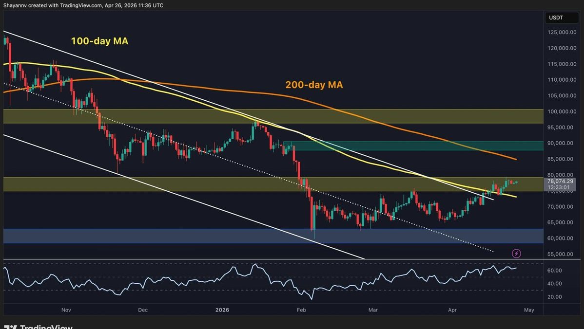Dark Mode Toggle Ball Crypto News Today Market Updates Margin Trading Guides Videos Price Analysis BTC Analysis ETH Analysis XRP Analysis Bitcoin For Beginners Interviews Editorials DeFi & NFT Buy Crypto Language Bulgarian Turkish Spanish © Copyright CryptoPotato Home » BTC Bitcoin is trading at $78k, closing out the final week of April with a quiet but persistent grind higher that has now taken price above the $75k–$80k resistance band’s midpoint. The move has been orderly rather than explosive, and that measured character, combined with what the derivatives market is currently showing, may actually be setting up a more powerful move than most expect. The daily structure continues to improve. BTC has now spent several consecutive sessions above the former descending channel, the 100-day MA has been reclaimed, and the RSI is trending upward toward around high-60s, which shows building mo